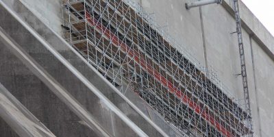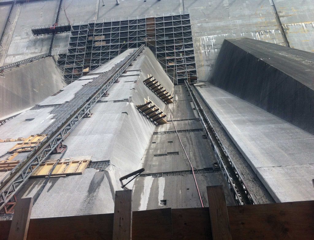 Placement of concrete on vertical and sloped faces of the power generation dam.